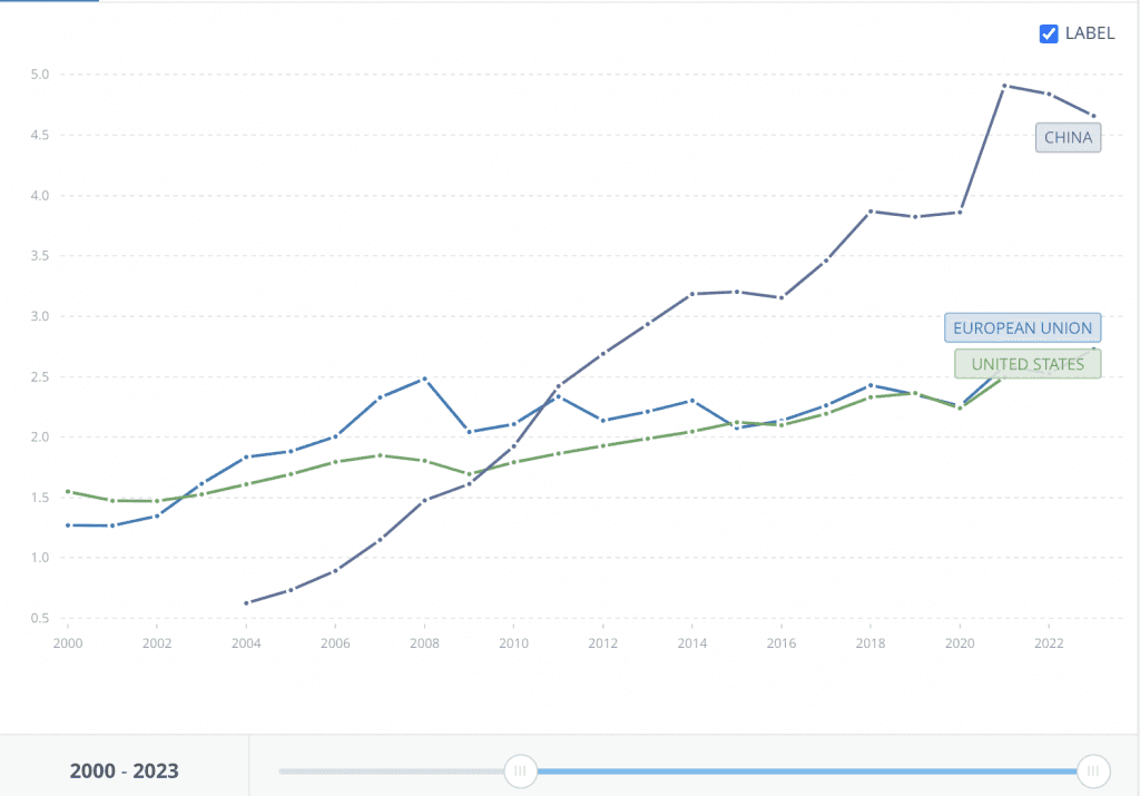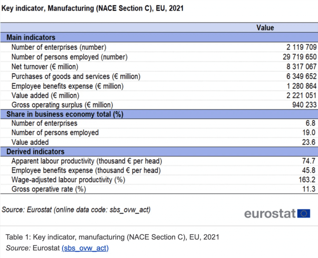 This is highly impactful. Manufacturing is one of the European Union’s key industries, with €8.3 trillion in net turnover and 28.7 million people employed in 2021 (as seen on Eurostat), representing 23.6% of the total value added of the EU’s economy.